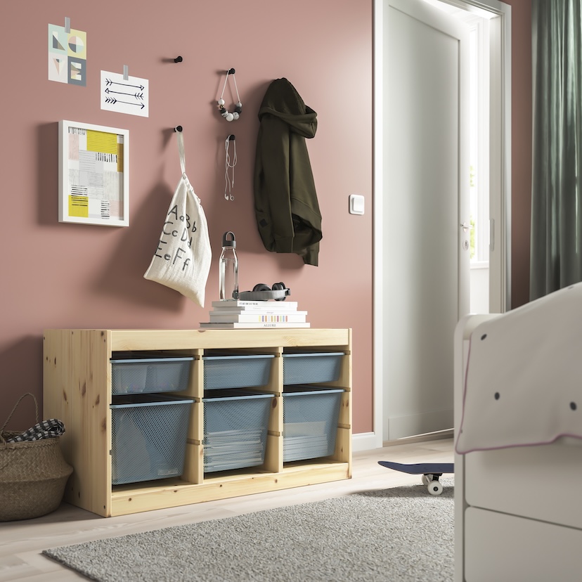 A few simple storage solutions can help keep everything in order—and within reach. The TROFAST system with mesh boxes is perfect for quickly stashing toys or supplies. Add a SKÅDIS pegboard near the desk to hold markers, scissors, and those little odds and ends that always go missing.
